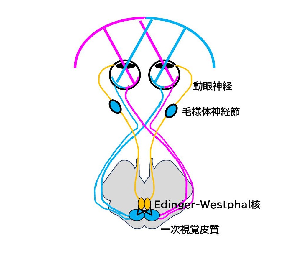 そもそも、対光反射の経路は図1の通りで、光刺激が瞳孔を通り網膜で感知され、刺激が視神経に伝達して、一次視覚皮質からEdinger-Westphal核を経て、毛様体神経節まで伝達し、動眼神経を介して瞳孔括約筋の収縮に至るという経路になっています。なお、対光反射の経路は、「対光反射シミュレーター」というものがMEDIC MEDIA社のwebページで公開されており、この経路を理解するのに非常に有用と思われます[1]。